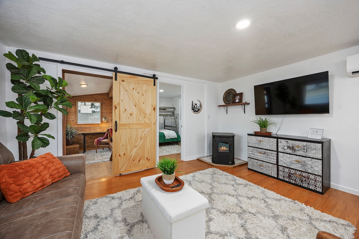 If you’ve stayed in Airbnbs with uncomfortable furniture and barely usable kitchens, you’ll feel the difference here. This second-story studio is designed for comfort and ease. King bed, a down-wrapped sectional you can actually stretch out on, fast WiFi, a kitchen stocked for cooking, a washer/dryer, off-street parking, a private deck, mountain views, and easy access to the valley. 2-minute drive to the airport. Quiet neighborhood with nearby commercial buildings. Especially peaceful at night.
