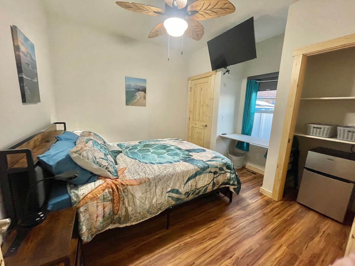 You won’t want to leave this charming, one-of-a-kind place. This NO shared spaces unit is beautifully decorated as a paradise escape where you can relax at the end of a long day. There is 1 regular queen bed and 1 queen sofa bed. The private bathroom encompasses a shower and a deep bathtub. There are refrigerators, microwave, Keurig w/coffee, toaster oven, small skillet, toaster, mini blender, kitchen utensils, & dishes. Come enjoy the turtle and sunset beach decor to brighten to your day!
