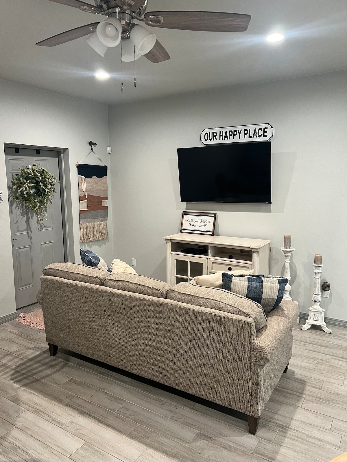 Beautiful garage apartment with unique hand-built glass garage door with lots of natural light. The main house is a duplex with two garage apartments in between. This listing is for one of the garage apartments. Premium 65-inch TV, Netflix, and high-speed Wi-Fi internet. Comfortable king-sized wrought iron bed and a handsome walnut desk for work/study.