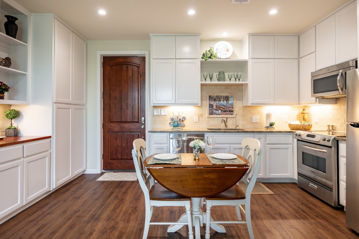 This quaint guesthouse is close to everything! Walking distance to downtown to experience food, wine, beer, art & the Lights Spectacular. A quick drive to Fredericksburg, Dripping Springs, Blanco, Marble Falls, Austin, and San Antonio! One bedroom with a queen bed and one bathroom. Full kitchen has Keurig, coffee fixings, pots and pans, oven and fridge to make breakfast or heat up your leftovers! Smart TV, games and books. Loveseat and dining table. Private entrance with a patio & a carport.