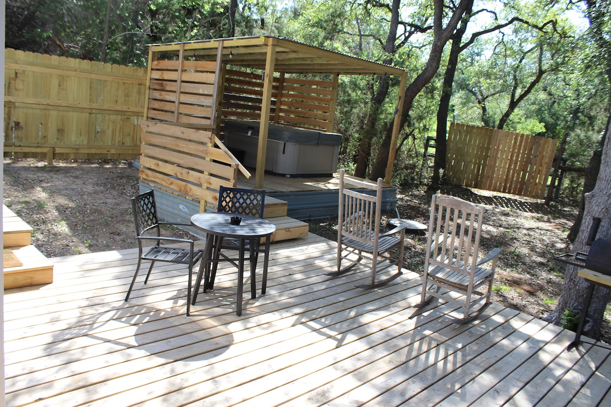 Contain and Chill is a place to do just that "chill." You can relax by the chiminea with a glass of wine, curl up to a good book in the hammock, or hit the deck 12 feet high or 20 steps up overlooking the hill country. The deck has a two-person hot tub and sitting area to enjoy the panoramic view of the hill country and catch the most breathtaking sunsets. This view takes stargazing to a whole new level. This unique home is not just a couple's getaway; it's an experience.
