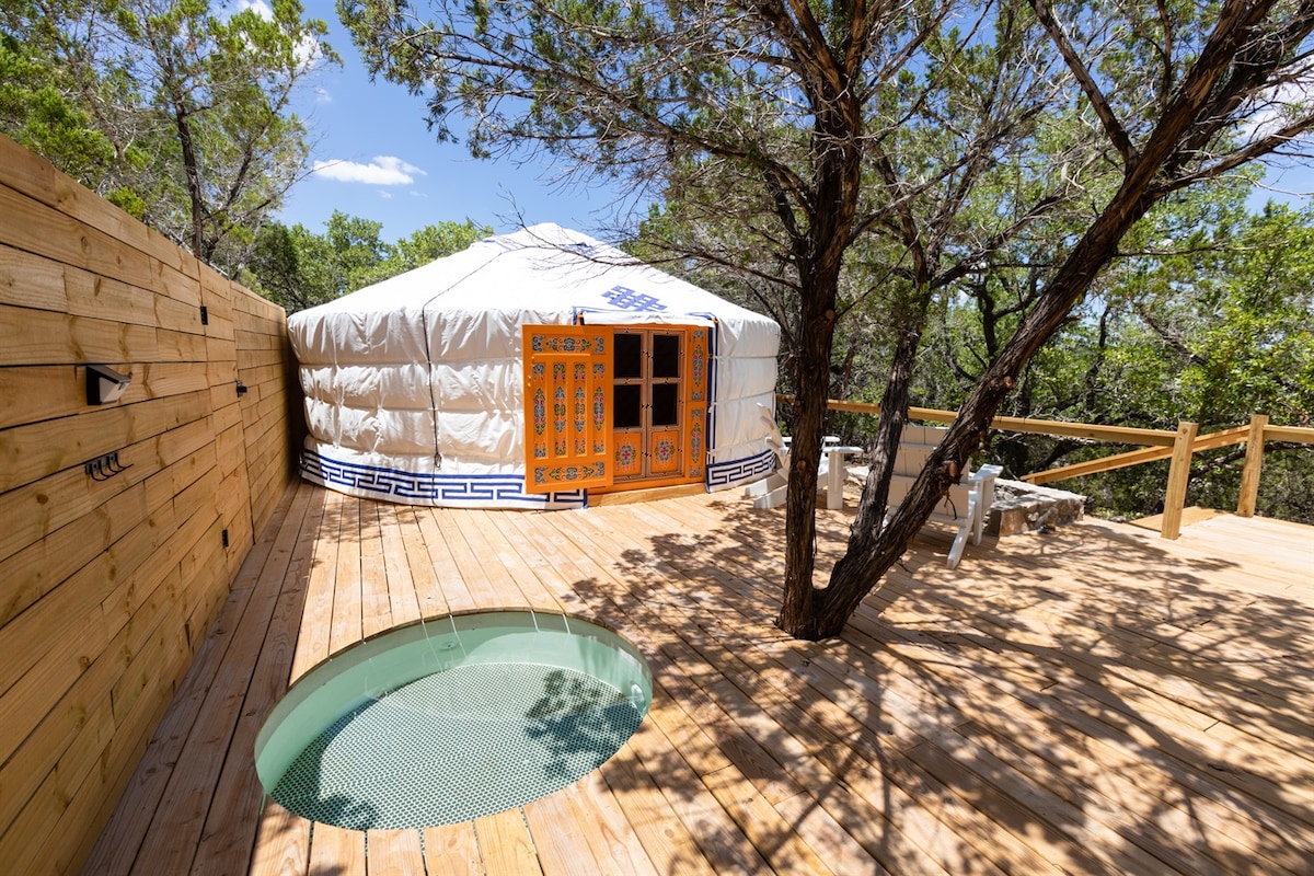 The Yurtopian's "Amie Ger" features a climate-controlled space with a king-size bed, private hot tub, fire pit, outdoor bathroom, kitchen, gas grill, and a rooftop deck. Amie Ger is situated in the middle section of our property and enjoys a beautiful, 180 degree view of the Texas Hill Country. Amie Ger has a huge cedar tree on the deck, shading the plunge pool/hot tub.