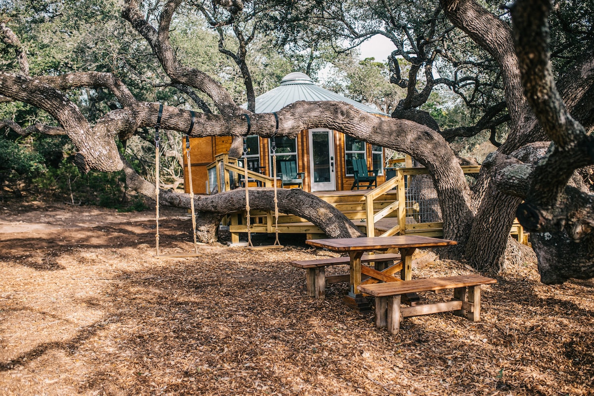This one-of-a-kind Treehouse Yurt is your PERFECT getaway from city life! Located in the heart of Texas winery and brewery country, your day trips are only minutes away in every direction! This one bedroom (king bed) is hosted by Airbnb's 2022 Top New Host of the State of Texas! Relax in the spa, stargaze, or sit around the fire under a 300-year-old Live Oak Tree! The Tangled Oak Yurt is tucked away on a beautiful 9-acre property and offers all your modern amenities plus a king-size bed!