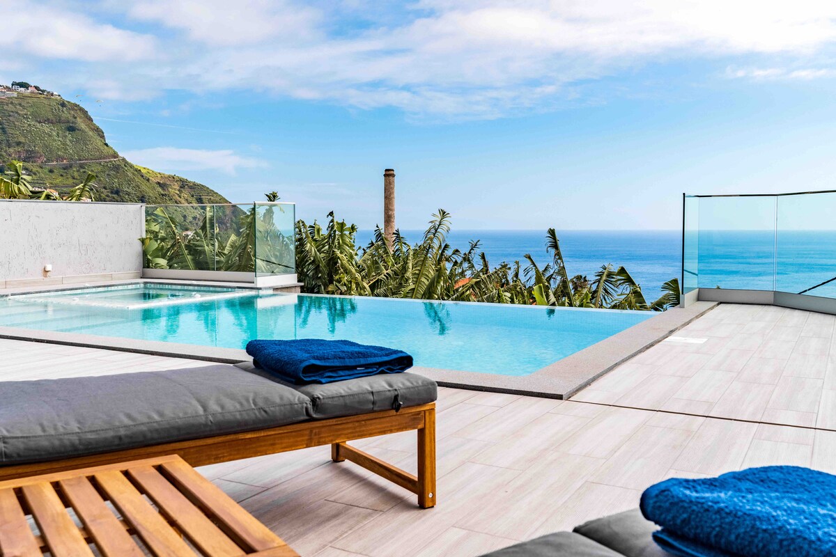 Meu Pé de Cacau is a tropical fruit garden surrounded by dramatic cliffs to the north-east and the vast Atlantic Ocean to the south-west. Four beautifully designed and sustainably built studios share the property with an infinity pool, social areas and luxurious plantations hosting hundreds of different tropical fruits, planted on traditional agricultural terraces hand crafted in basalt stone.