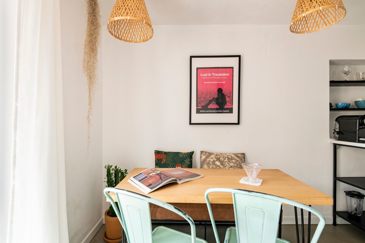 This apartment with 103 square meters is located on the second floor and divided in two floors. In the lower floor, there is a bedroom with queen-size bed, a spacious bathroom with shower and a french balcony. In the upper floor, there is a large living room with sofabed (capacity for 2 guests) fully equipped kitchen, laundry, bathroom with shower and a charming balcony where you can have your meals.