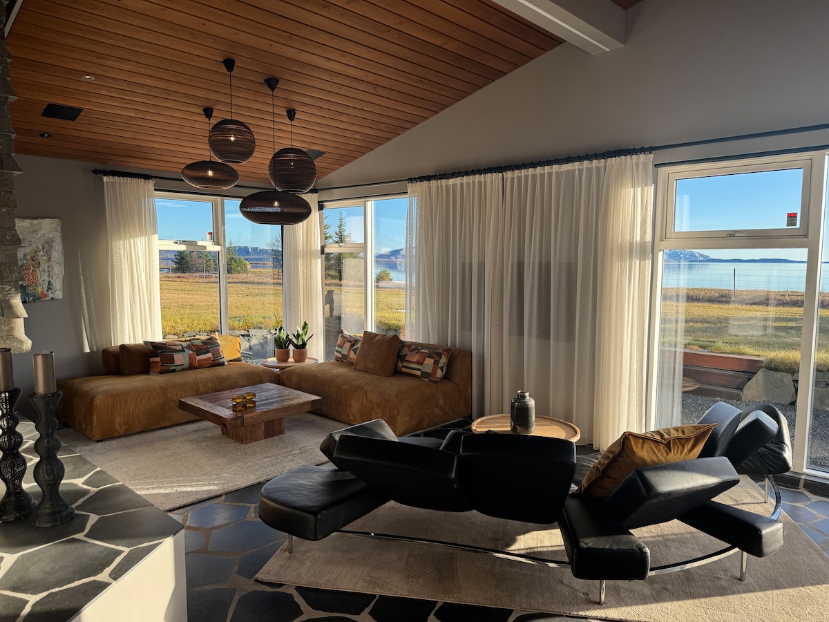 A peaceful and elegant cottage by Lake Þingvallavatn with a hot tub and stunning views, the perfect place to relax, enjoy nature and recharge your batteries. The cottage offers a warm and comfortable space with stunning views of the lake and surrounding mountains. 2 bedrooms with comfortable beds, a guest house and a sleeping loft Fully equipped kitchen and cozy living room with fireplace Large terrace with dining and barbecue facilities Hot tub and stunning views of Lake Þingvallavatn
