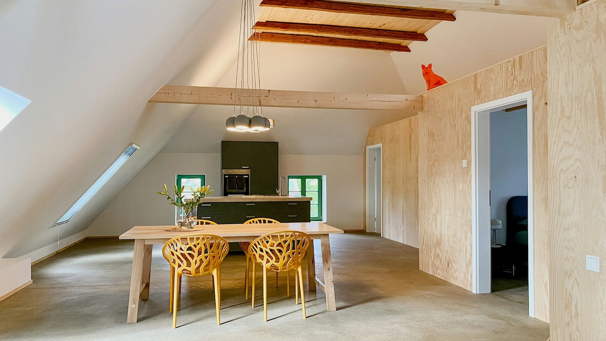 Sonnig, großer Garten, familienfreundlich und Feuerstelle: Die schöne Ferienwohnung in einem ausgebauten Stall ist ideal für Menschen, die Ruhe, Auslauf und Natur suchen. Ihr könnt Lagerfeuer machen, Fahrradausflüge oder in der Gaube sitzen und die unverbaute Aussicht über Garten und Weiden genießen. Ein schöner Badesee ist per Fahrrad zu erreichen. WLAN (ca. 23/7 MBits) und Waschmaschine sind ebenso vorhanden wie zwei eigene Eingänge. Die Sauna kostet 10€ für 2 Stunden, jede weitere Stunde 5€.