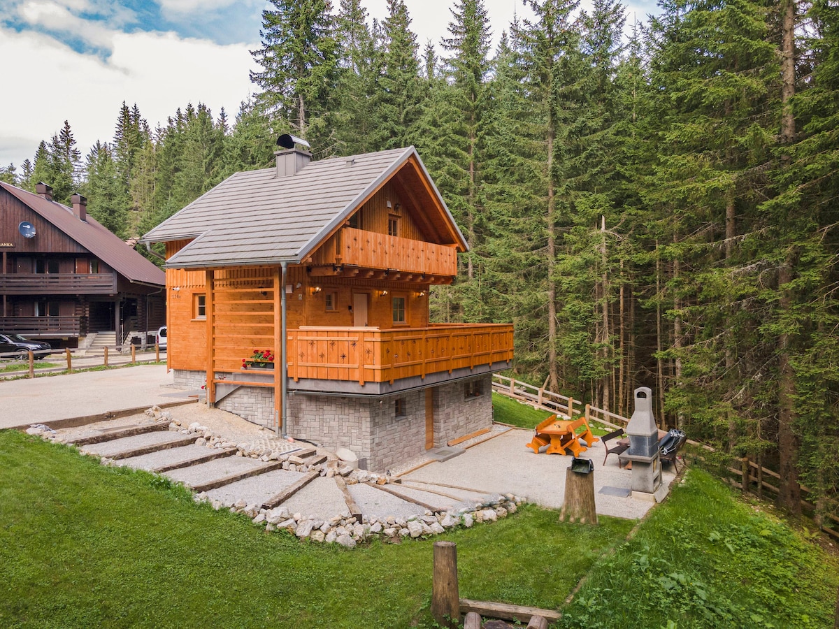 Our cosy alpine house with Triglav mountain view from romantic wood fired hot tub, large garden, surrounded with pine trees in a very nice, quiet area with beautiful alpine houses - 2km distance from Bohinj lake! Two floor house acommodating up to 4 persons, with living room, 3 bedrooms, kitchen, 2 bathrooms and a wellness place in basement. Many activities are possible in the nearby- winter or summer sports, hiking, biking...