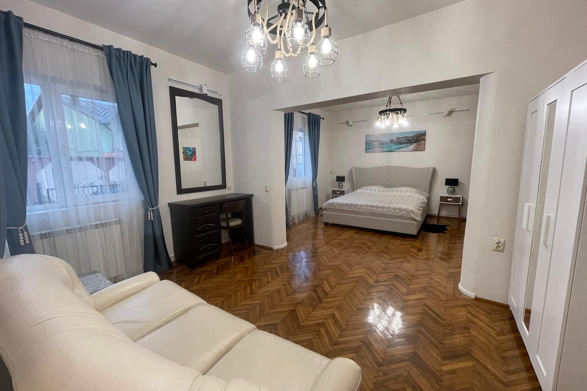 We're very thrilled to offer this gem of a fully restored 150 years old centrally located house, designed by the renowned Romanian-born American Artist & Set Designer Meda (that was born in the house). Offering 2 large bedrooms (one of which can be additionally divided in 2 more rooms by a floor to ceiling room divider) with 3 beds, the place is bosting stunning outdoor views, surrounded by lush greenery that can be enjoyed from the private front patio. Enjoy easy access to everything Ploiesti.