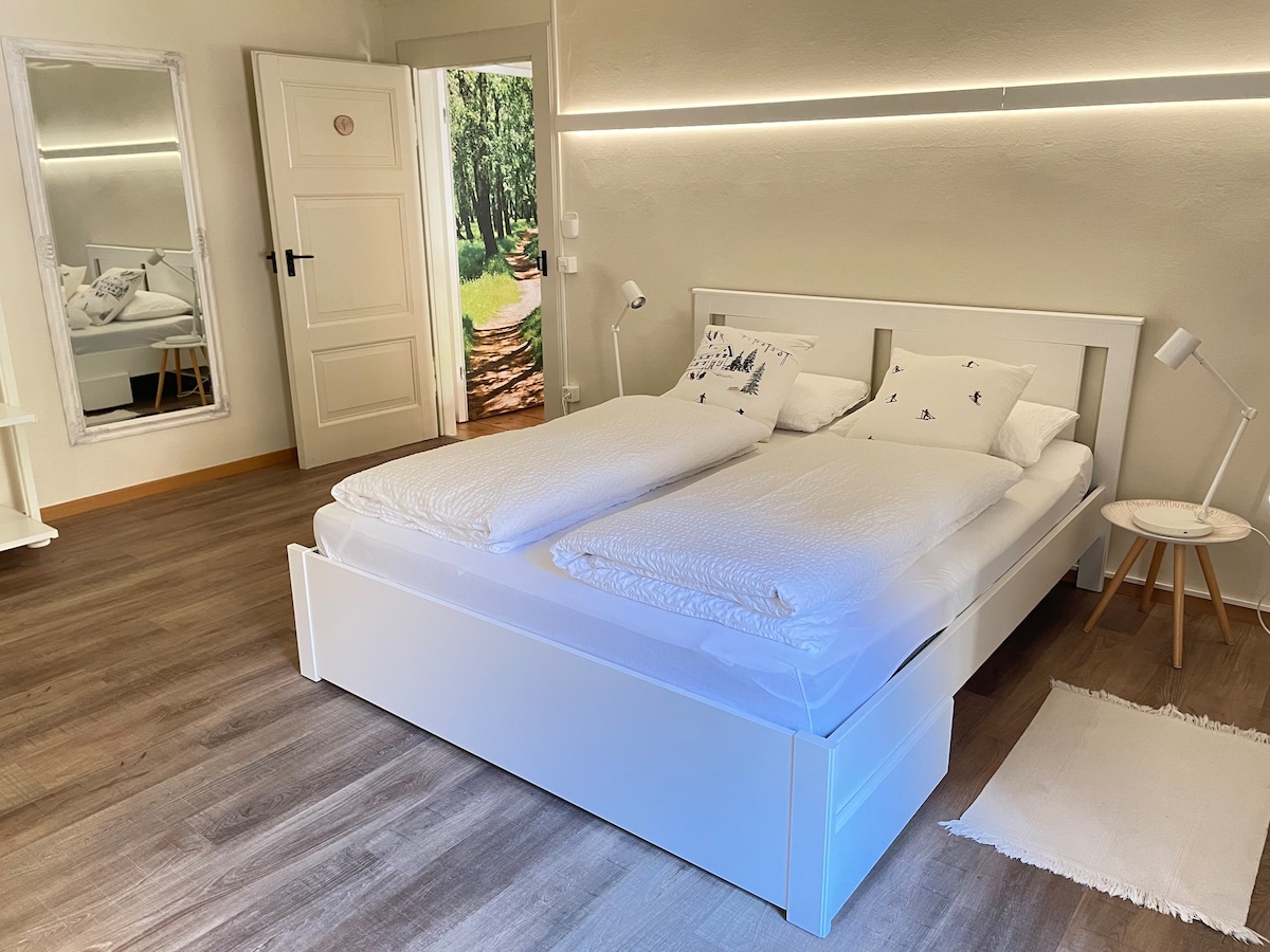 Appartamento situato in un paese tranquillo, ai margini del bosco. Situato al pian terreno con entrata indipendente, composto da: - cucina abitabile completa di tutti gli elettrodomestici (piano cottura, forno, microonde, lavastoviglie, frigorifero, macchina del caffè ) - salotto TV - bagno con vasca e doccia - 1 camera da letto con letto matrimoniale - 1 camera da letto con 1 letto singolo + 1 letto ad uso singolo o matrimoniale - locale lavatrice + ferro da stiro - WiFi free - Parcheggio auto