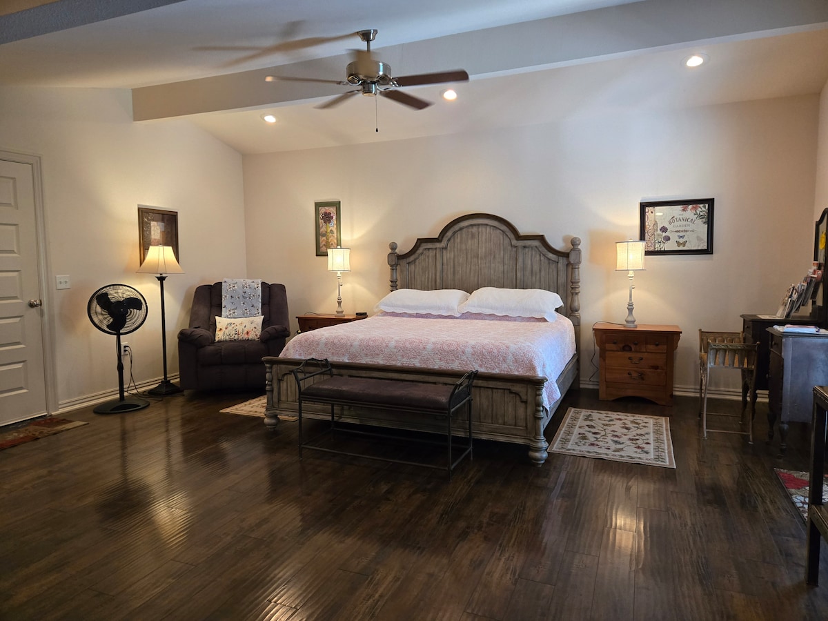 Enjoy a peaceful, private space on ten acres of a park-like setting with beautiful tree covered drive. You will have the entire three bedroom home to yourself with an attached single car garage, full kitchen, master suite and two other bedrooms with another full bath. Utility room with washer and dryer for your use. Superfast internet/wifi connection with up to 100 Mbps speeds for work or streaming. Roku 4K+ in living room for streaming your favorite services along with premium cable service.