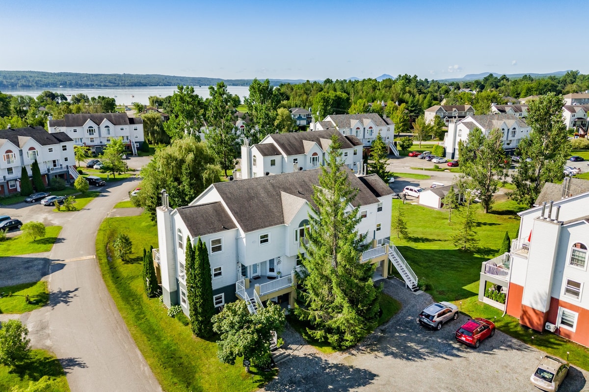 This is your lovely vacation home in the beautiful Eastern Townships area. It's a cozy condo with 1 bedroom of a queen bed and 1 floor mattress in the living room. Perfect for couples, solo travelers and families (with children). Only a couple of mins walking from Lake Memphremagog, and 5 mins driving from Mont Orford Ski Resort. Free WiFi and Free Parking. Wood floor, full kitchen, 1 bathroom/amenities, washer, dryer, dishwasher, wood burning fireplace, big terrace and BBQ.