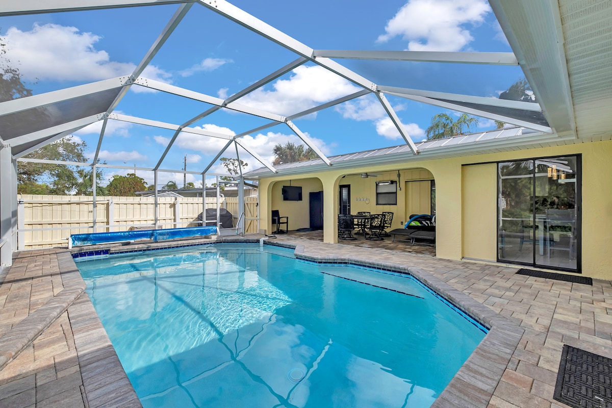 Enjoy this completely renovated, private home with 4 bedrooms 3 bathrooms, 2 queen sofa beds , Heated Salt Water Pool. Relax and enjoy the sunsets or watch your favorite programs in the covered and heated lanai with fridge . Only blocks away from Great Shopping and Dining. Golf, Fishing and Beaches are just a short dive away. Enjoy preparing meals in a well equipped large kitchen with air fryer and large outside BBQ. Come relax and enjoy the Beauty of Florida. No disappointment here !!