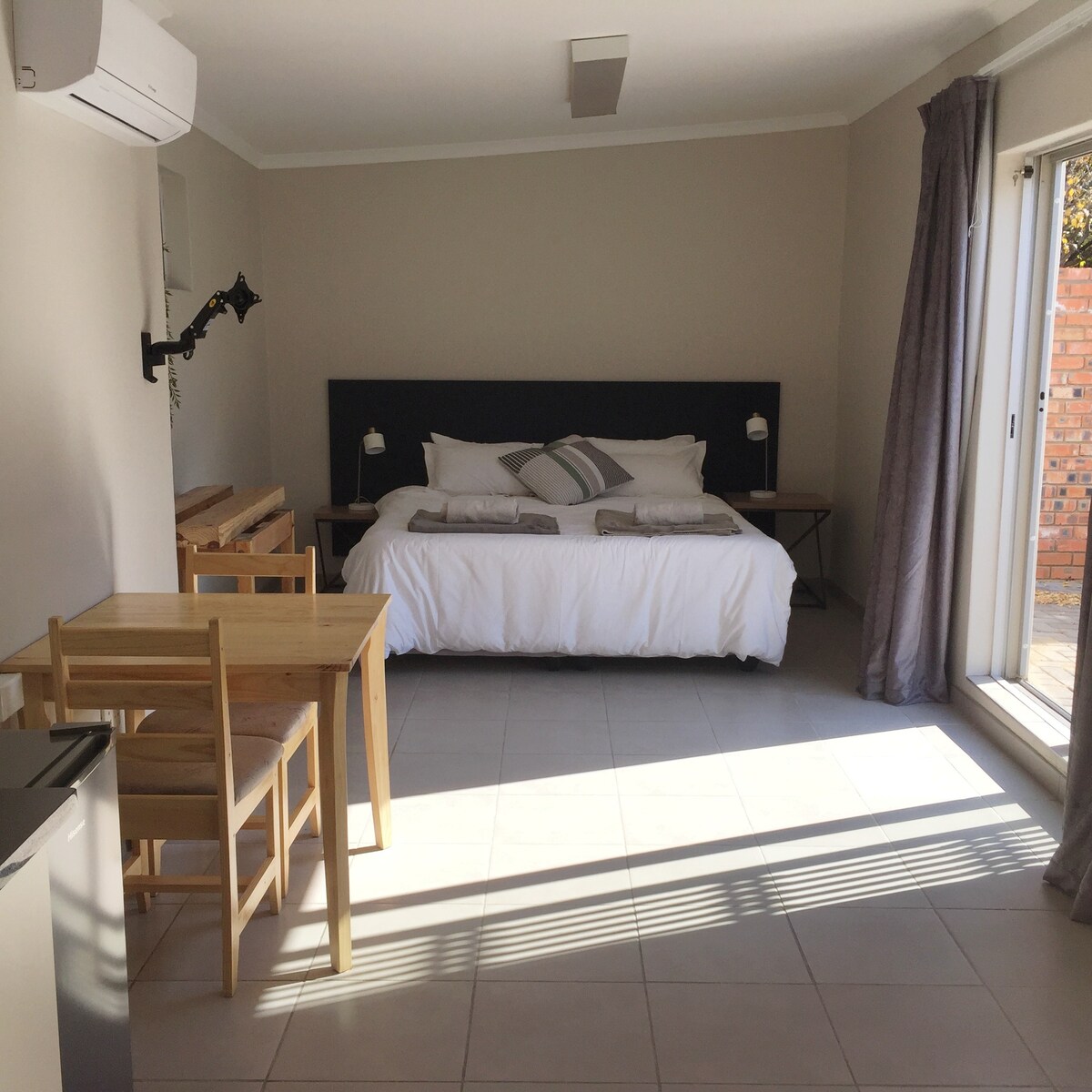 Spacious Urban Suite next to a peaceful green area with one open plan bedroom, kitchenette and bathroom (with a shower). Lovely outside space and seating area. Secure parking with CCTV cameras. Uncapped fibre internet and wifi with TV and Netflix. Close proximity to gym (1.7km) ; restaurants and bars. +- 3 km from N1. +-6 km from University of the Free State +- 7 km from Grey College +- 7 km from Mediclinic Hospital and Mimosa Mall