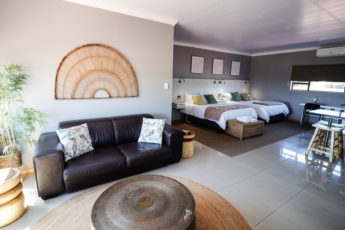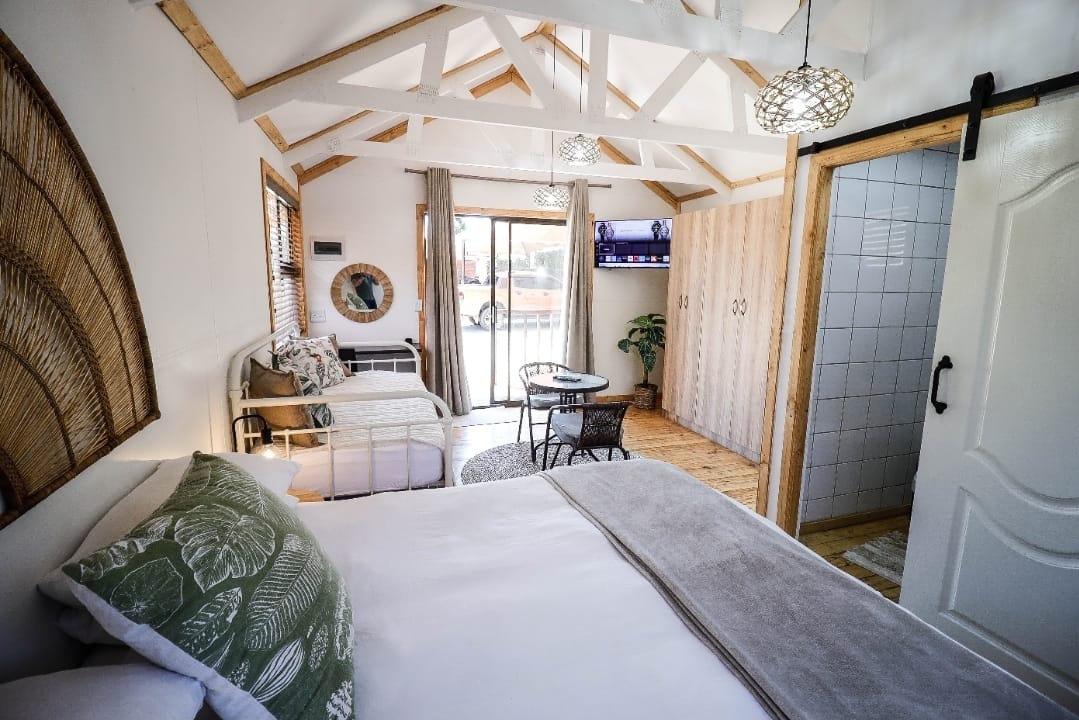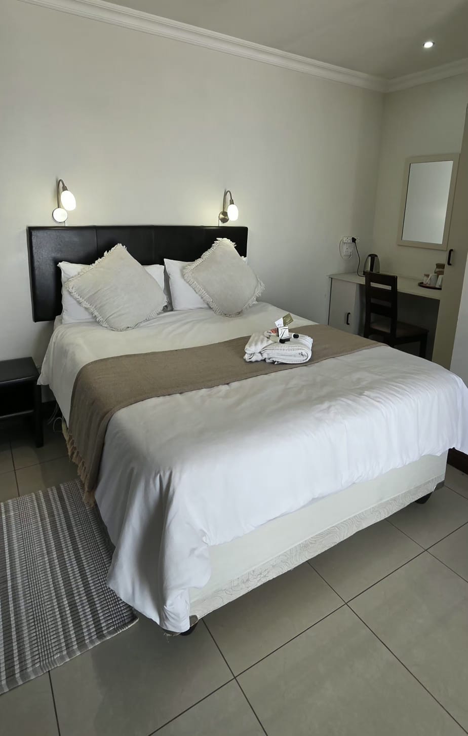 Luxury standalone chalet, offering privacy, comfort, and beautiful garden views. It features a queen bed, comfortable living area, and a kitchenette with the essentials for light self-catering. Modern design blends with historic stone and warm wood finishes to create a refined yet welcoming space. Guests can enjoy a private patio, braai area, and fully fenced garden, making the chalet both relaxing and pet friendly. Perfect for couples or travellers seeking a peaceful stay in Bloemfontein.
