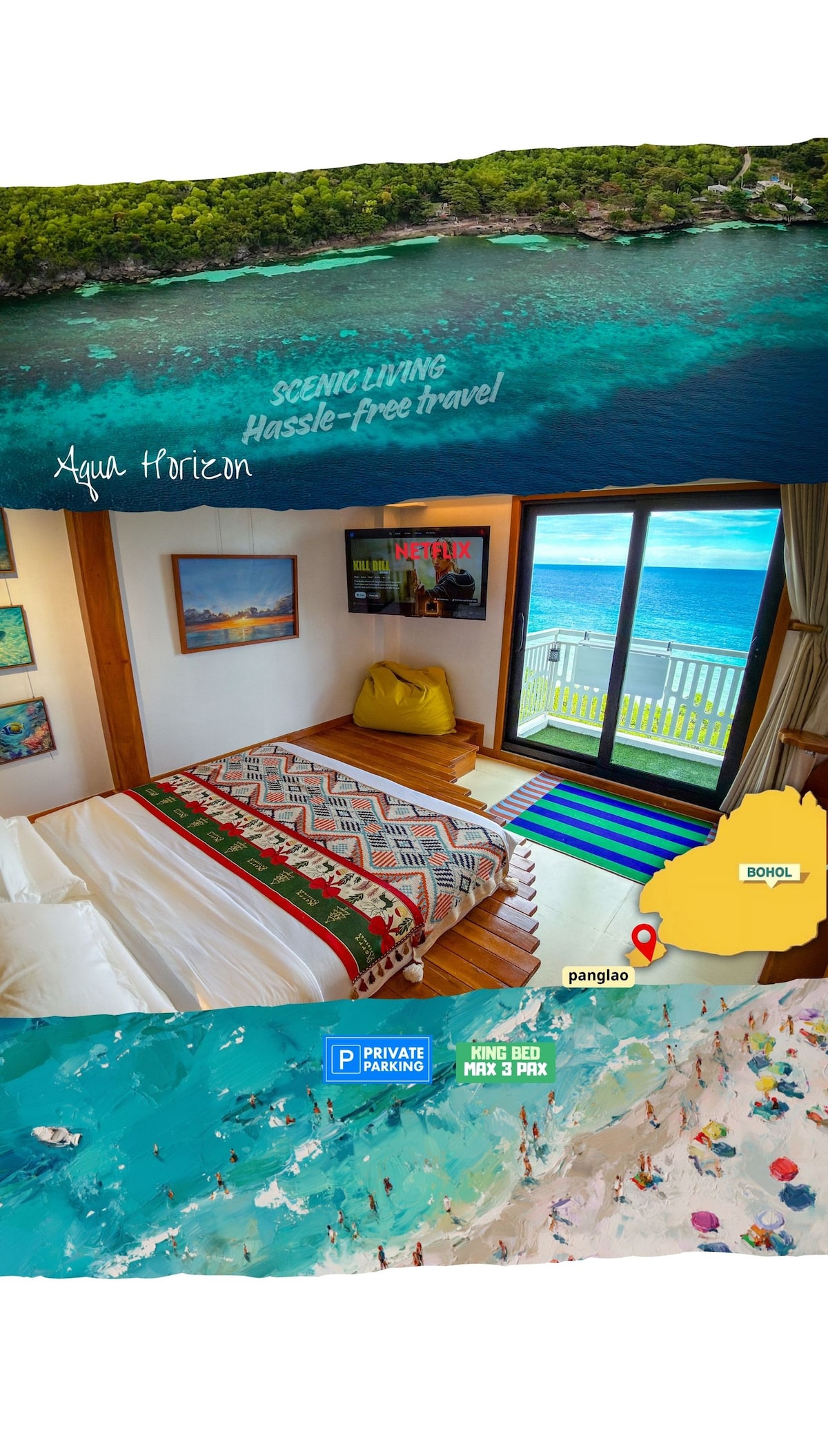 Aqua Horizon Panglao YS海景艺术公寓,配有特大号床