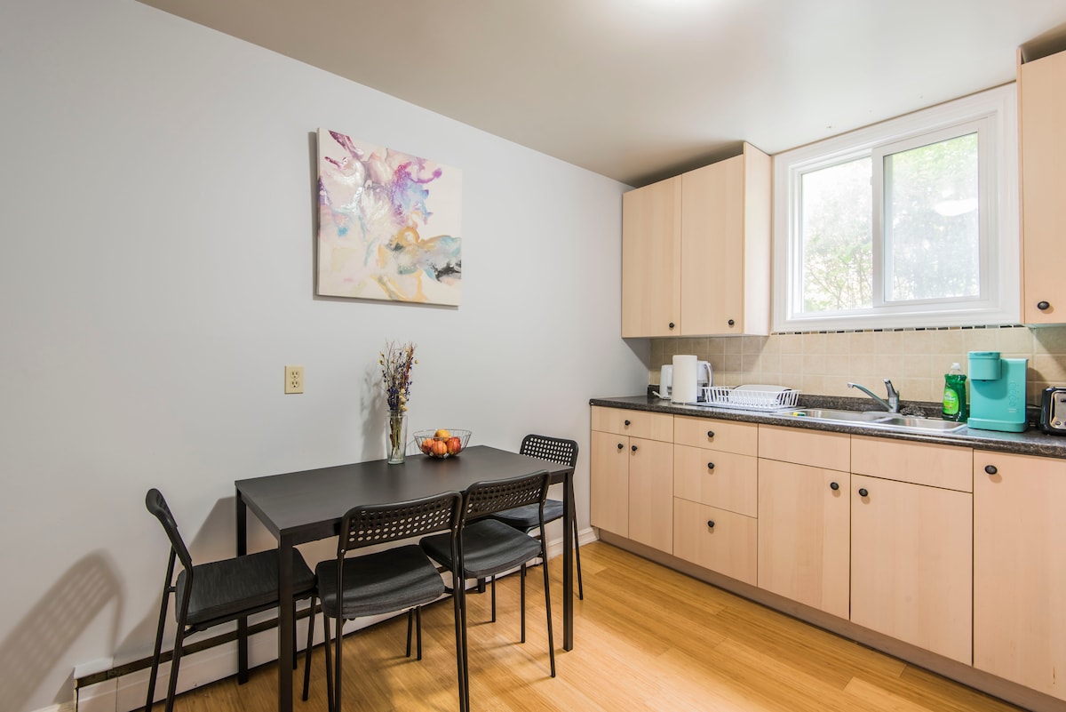 This studio apartment is simply lovely. Ceilings are high and there are hardwood floors and original moulding and trim. It has a very cozy feel and is decorated simply and tastefully. You will love the comfy and clean feel of this apartment. The kitchen is fully stocked and allows guests the ability to cook as they like. The central location (7 minute walk to the Kitchener Market) and easy access to public transit make it very easy to navigate the city. There is one parking space available
