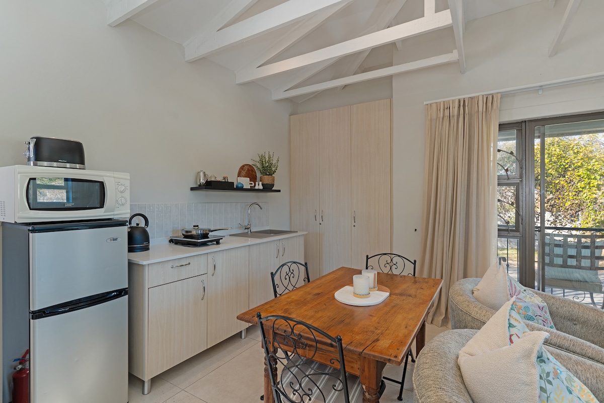 This stylishly furnished open plan garden cottage with wooden floors & a fully equipped kitchen with a garden. A queen size bed, wardrobe, bedside tables, a seating area has a sofa (sofa bed), chair, coffee table a satellite TV/radio, plus a dining table and chairs. There’s tastefully finished ensuite shower room. A private garden with patio dining area & a Braai/BBQ with sun loungers and wind chimes is set among grapevines, fruit & citrus trees and overlooks a vegetable and herb garden.
