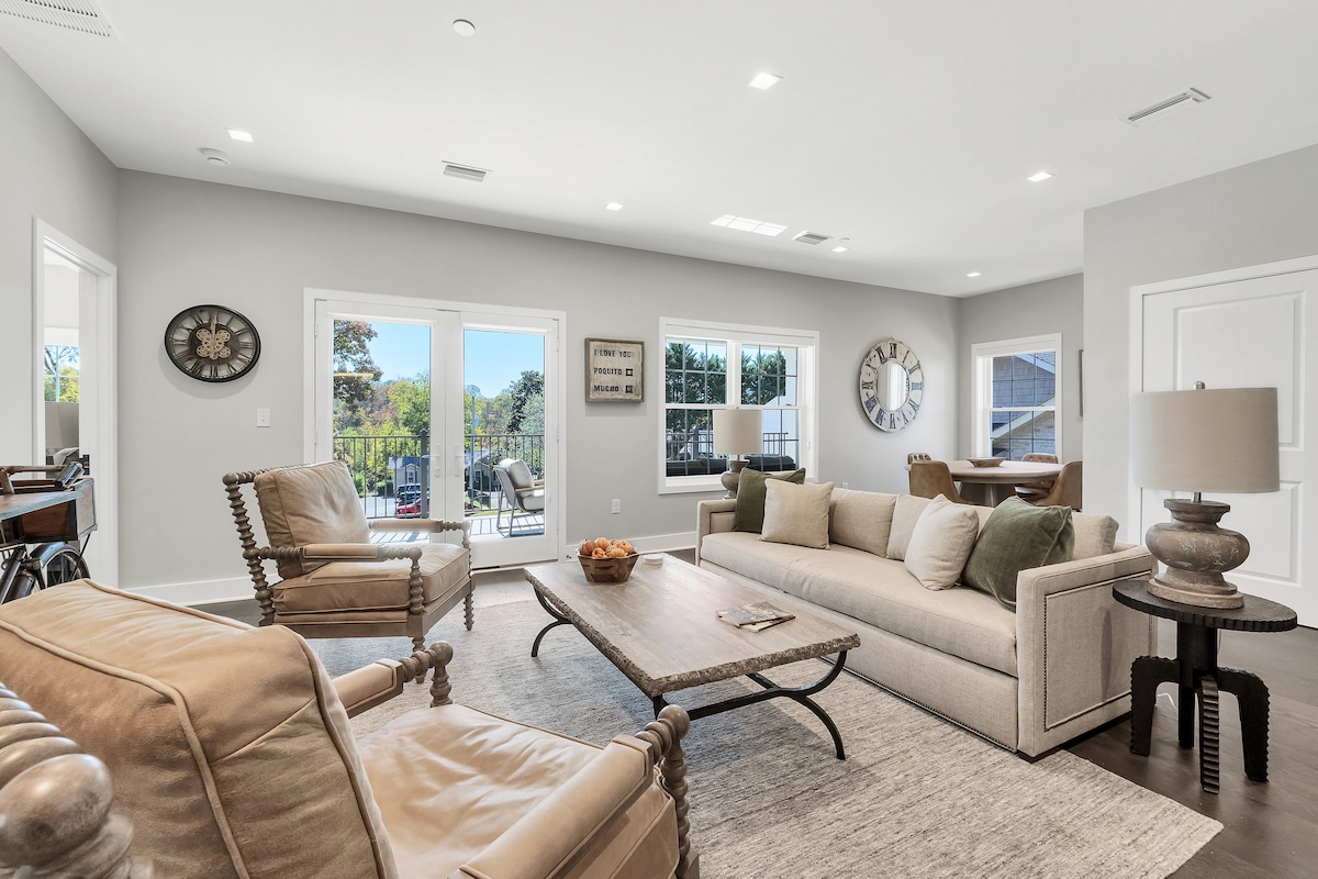 Welcome to the cozy and stylish living space of Scots Suite, where comfort meets charm. The living room features a sleek, modern design with warm touches, such as plush seating and vibrant accent pillows. Framed art showcasing local scenes adds a personal, college-themed touch. Relax on the comfortable sofa or enjoy a meal at the dining nook, perfect for unwinding after a day of exploring downtown Maryville or visiting nearby Maryville College, just a short walk away.