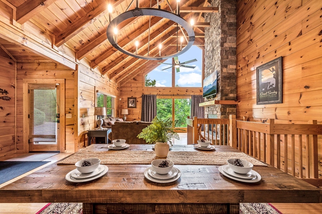 My house is a log cabin style home, with rustic and cottage décor. It is in the foothills of East TN, in a very peaceful neighborhood. It is located on a hill and has a beautiful view. You will have the entire front part of the house with a private entrance, patio, front porch and parking. You will have private access to all of what is pictured. Please let me know how many people will be in your group.