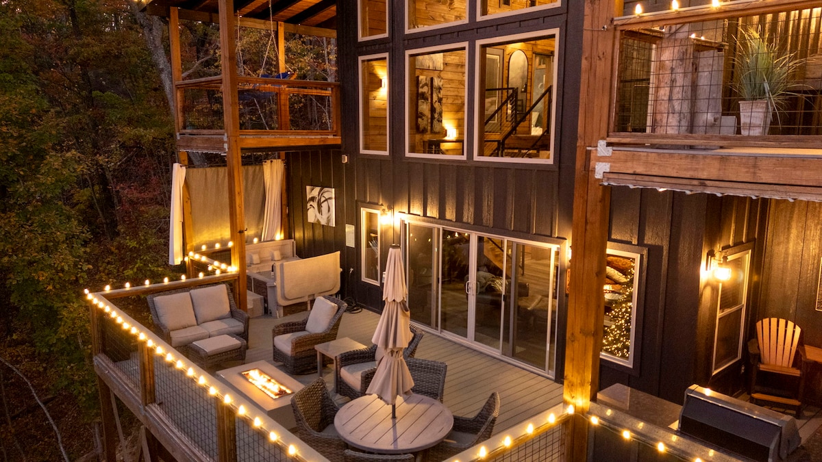 This place is anything but ordinary. The Smoky Mountain Treehouse is the only one of its kind in the area - a luxurious, custom-built treetop experience with a spectacular view and the comforts of home, and then some. Cross the 40’ swinging bridge and enter the grand arched door where you’ll be transported to a place where the nostalgia of a treehouse is combined with the luxury of modern day. This unique property has everything you’ll need for a romantic or adventure-filled getaway!