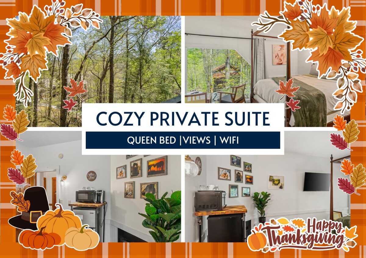 ★ “We sat on the balcony watching the moon rise over the Smokies… it was the perfect little getaway.” ★ Welcome to Blissful Breeze—your dreamy escape in Townsend, TN. Nestled into the hillside with mountain views, warm wood walls, and a romantic four-poster bed, this cozy room offers a private balcony for slow mornings or starry nights—plus complimentary breakfast to start your day right.