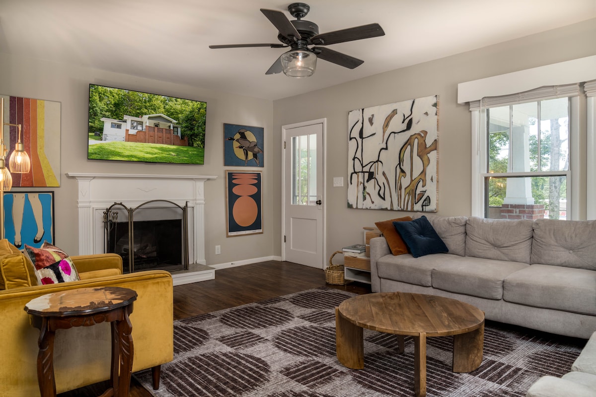 Walk out your front door to Springbrook Park! Walking trails, duck pond, playground, restaurants, and convenient store only walking minutes away! Fabulous sun porch to lounge or work on and fire pit to enjoy the starry Tennessee evenings! 1.4 miles from the Knoxville Airport. 11 miles to Neyland Stadium and Downtown Knoxville. 14 miles to Cades Cove! Bring your dogs and babies! Bassinet, baby swing, and pack n' play available on request. Come take a picture with Dolly and Smoky MTN mural!