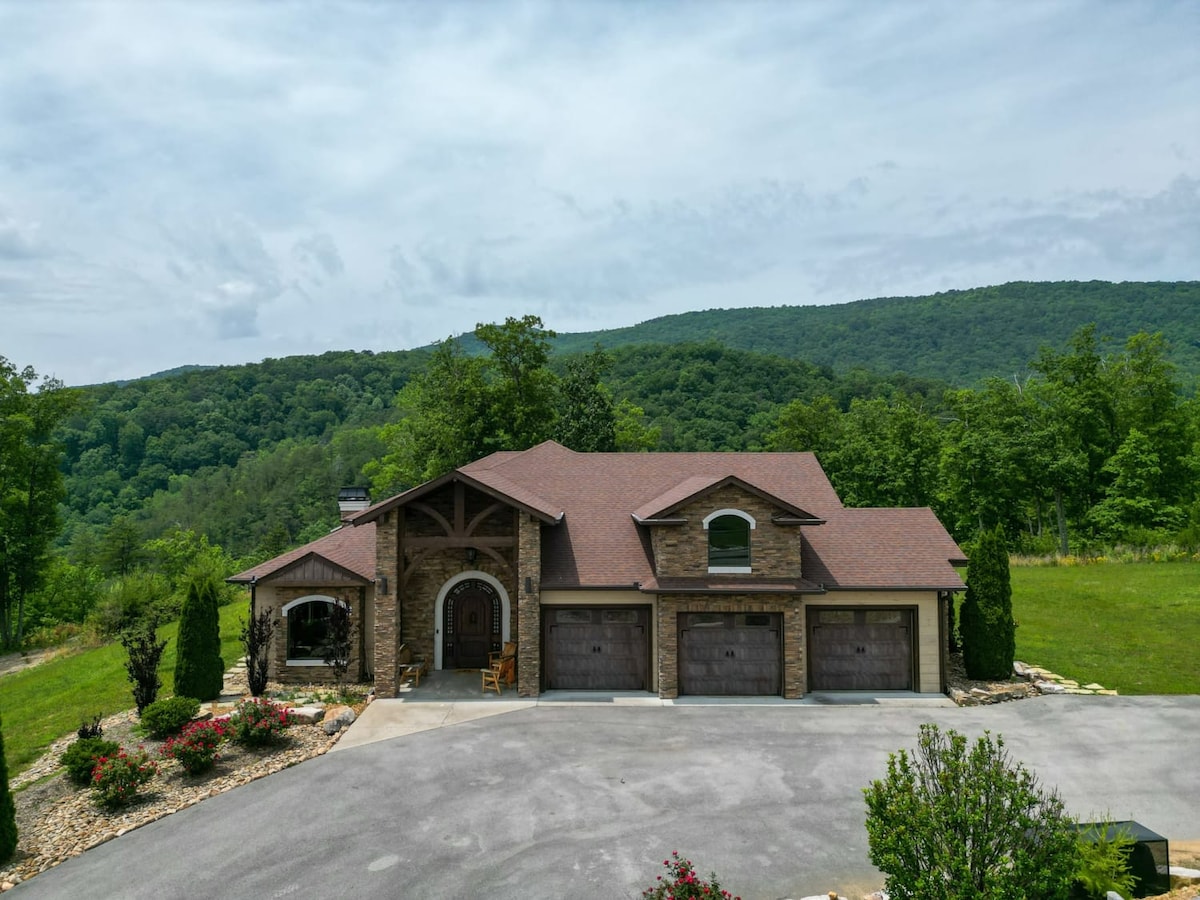 Nestled between Knoxville and the Smokies, this modern A-Frame is a dream getaway! Relax in the soaring living room with a massive stone fireplace, or challenge friends in the game room featuring ping pong and boss toss. The fully stocked chef’s kitchen is perfect for home-cooked meals, and the private hot tub is waiting for you after a long day of adventures. Enjoy your morning coffee on the balcony with forest views, then explore Pigeon Forge!