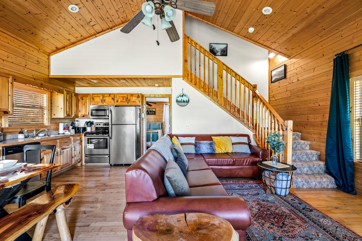 Take it easy at this unique and tranquil log cabin getaway. Floor-to-ceiling windows provide beautiful mountain views. There is one bedroom with a king bed, a loft sleeping area with a king bed, and a queen sleeper sofa in the living room making it perfect for a couple, a family, or a group of friends. The kitchen is fully equipped and includes a dining area for 6. There is also free wi-fi and a 400 game arcade table The cabin is located just 20 minutes from everything Pigeon Forge has to offer