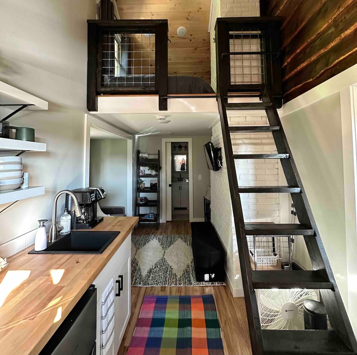 Tiny home cabin, set in a grove of trees yet 10 minutes to downtown Boone. Intimate, two-person hot tub. Propane fireplace, two mini-split ac/heaters, two tv's fully loaded, full size fridge, oven, stove, microwave, dishwasher, washer/dryer, private bedroom on main floor, loft with queen bed. Covered porch with grill and hot tub, fire pit out back. Beautiful neighborhood walks and wildlife.