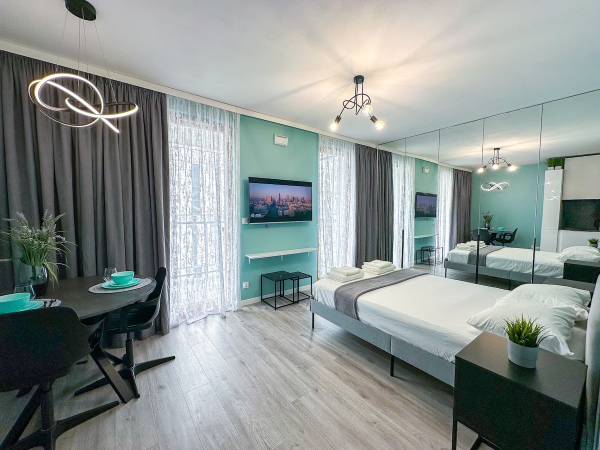Komfortowy apartament z widokiem na centrum Warszawy urządzony w nowoczesnym stylu. Wyposażony w najwyższej jakości sprzęt. Apartament położony jest w bezpośrednim sąsiedztwie komunikacji miejskiej, gdzie z łatwością dotrą Państwo do najważniejszych miejsc turystycznych czy też biznesowych. A comfortable apartment with a view of the center of Warsaw decorated in a modern style. Equipped with the highest quality equipment. Public transport nearby of apartment.