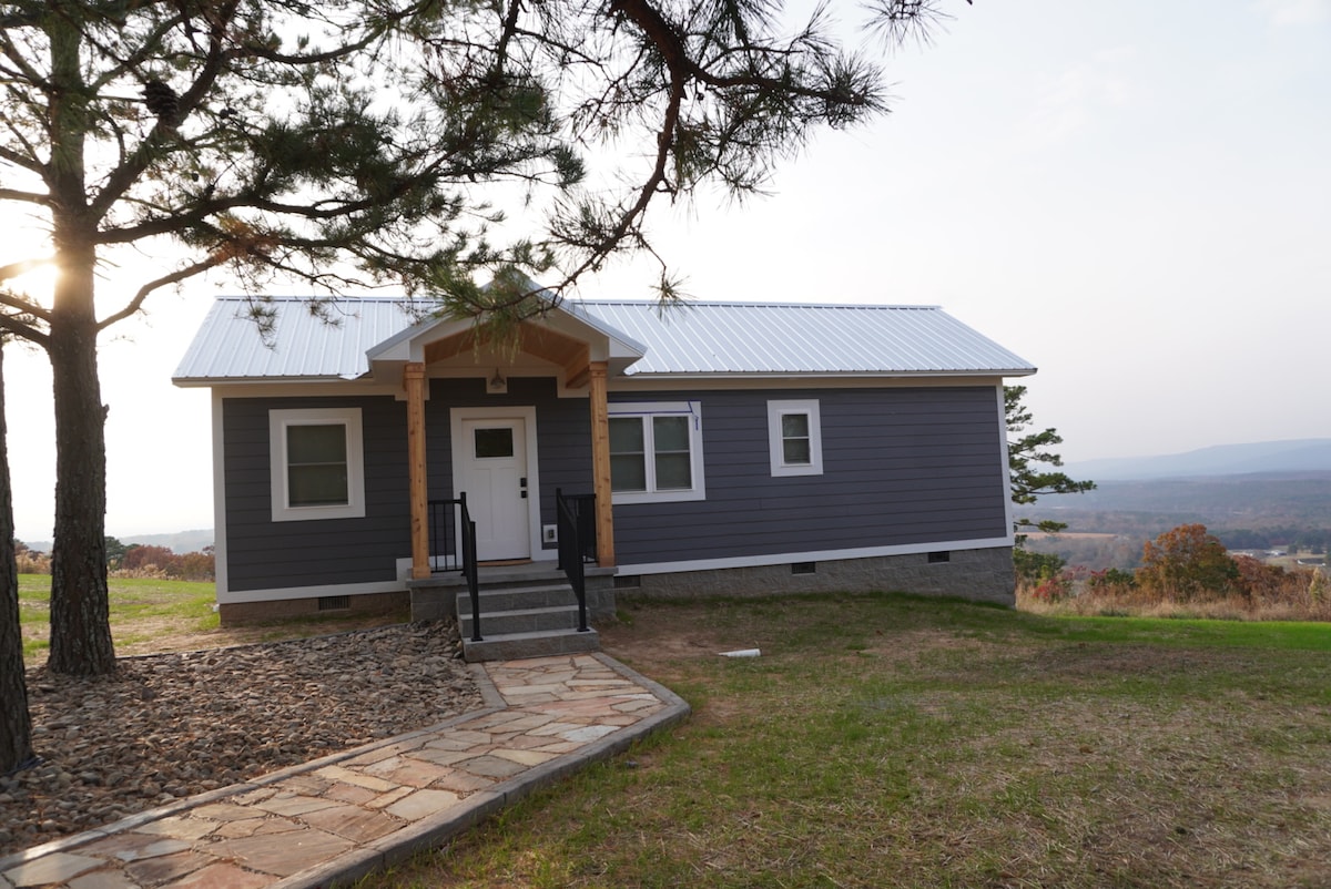 This cabin is located 8 miles from the town of Ozark, Arkansas in the Arkansas River Valley. The building is new with a kitchen, large bathroom, and one bedroom. The seating in the living room can also be used as a twin bed. The location is surrounded by old forest and is peaceful and quiet. A good location for kayaking the Mulberry River, swimming at Cove Lake, hiking Mt. Magazine or just resting in the peaceful countryside.