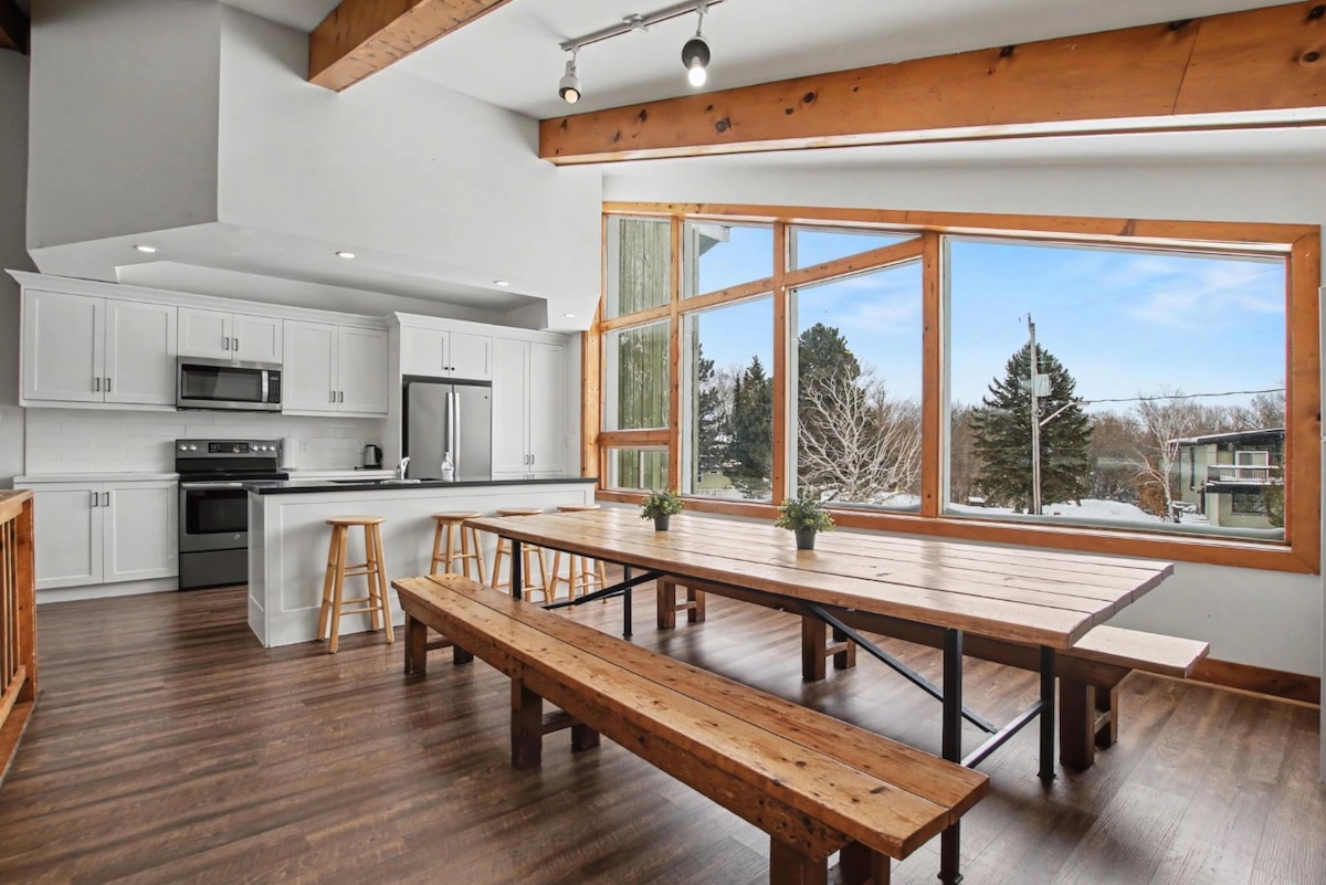 This Ski in/out chalet is only 13 min walk to the nearest Ski Lift. We have an outdoor Hot Tubs, an indoor Sauna, and Entertainment such as a Pool Table, video games and a large 75 inch HD TV for your movie nights. Surround your friends/families around our renovated Kitchen, large Centre Island and large Dining Room Table. Seat in our covered Sunroom to have a morning coffee or enjoy your BBQ food all year round. Worry free and leave your cars at our home: Only 7 min walk to the Village