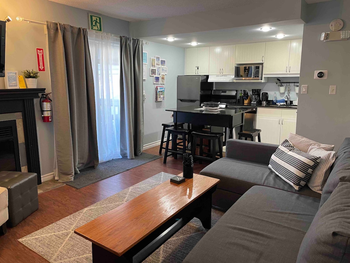 Unit located by Living Stone Golf Resort, minutes away from downtown Collingwood, and 10 mins from Blue Mountain/Scandinave Spa. Our renovated condo offers modern-chic elegance. Enjoy 625 sq ft of privacy with two bedrooms and one bathroom with tub and shower. There is also a sofa, electric fireplace, Netflix and basic cable, WIFI, en-suite washer-dryer. Outdoor terrace with garden views.