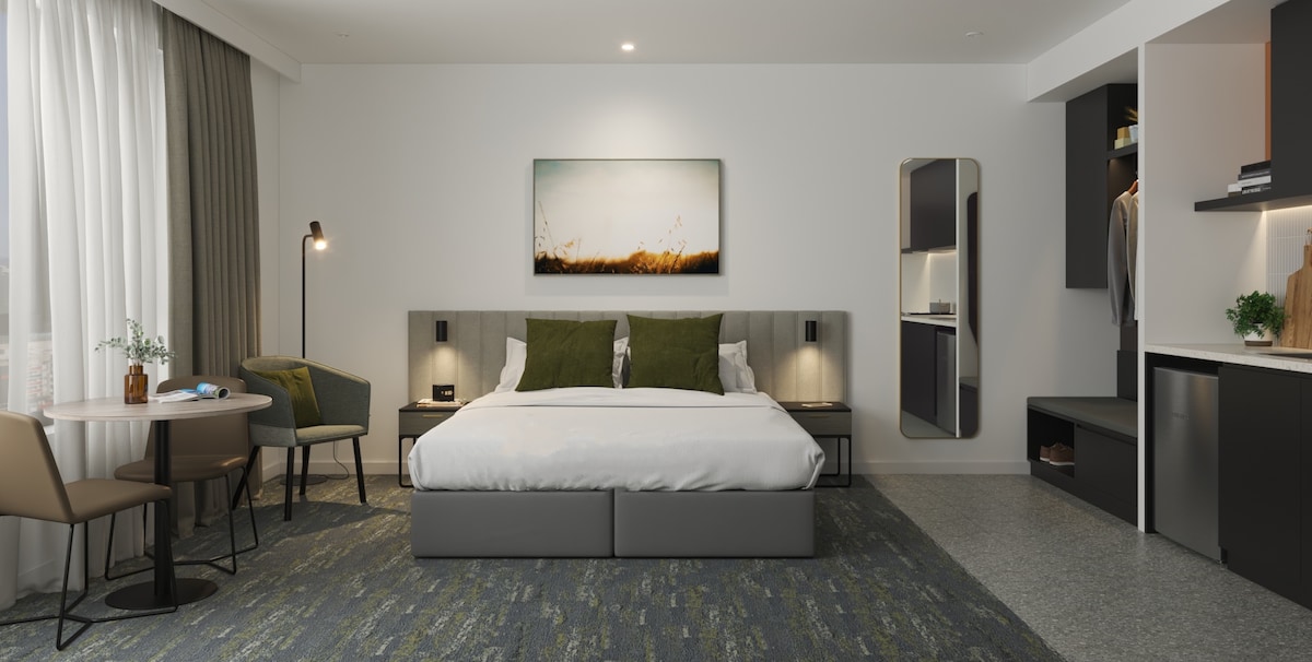 Feel right at home in the One Bedroom Apartment. There’s space to move, with a separate bedroom featuring a comfortable king bed and wardrobe. The relaxed living area contains a sofa, LCD TV with Foxtel and work desk, whilst the fully equipped kitchen provides a cooktop, oven and full-size fridge, and dining table. The bathroom offers laundry facilities, amenities and hair dryer. Guests can access the in-house gym.A daily housekeeping service is included (excluding Sunday and public holidays). Breakfast and restaurant options are available; contact us for details.
