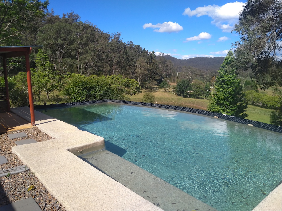The Villas: - 60m2 Open Plan Studio, Luxury King Bed - Large Sofa, dining table and sitting area - 1 private bathroom - Kitchenette - Fully equipped kitchenette supplied with utensils to cook on stove top - Communal Pool (not heated) - Baby Webber BBQ The Farm: - 2-hour drive from Sydney - 1-hour drive from Newcastle - 15 minutes from Polkolbin Included: - All linen including sheets, towels, blankets professionally laundered - Professionally cleaned - Access to Pool, sauna & hot tub
