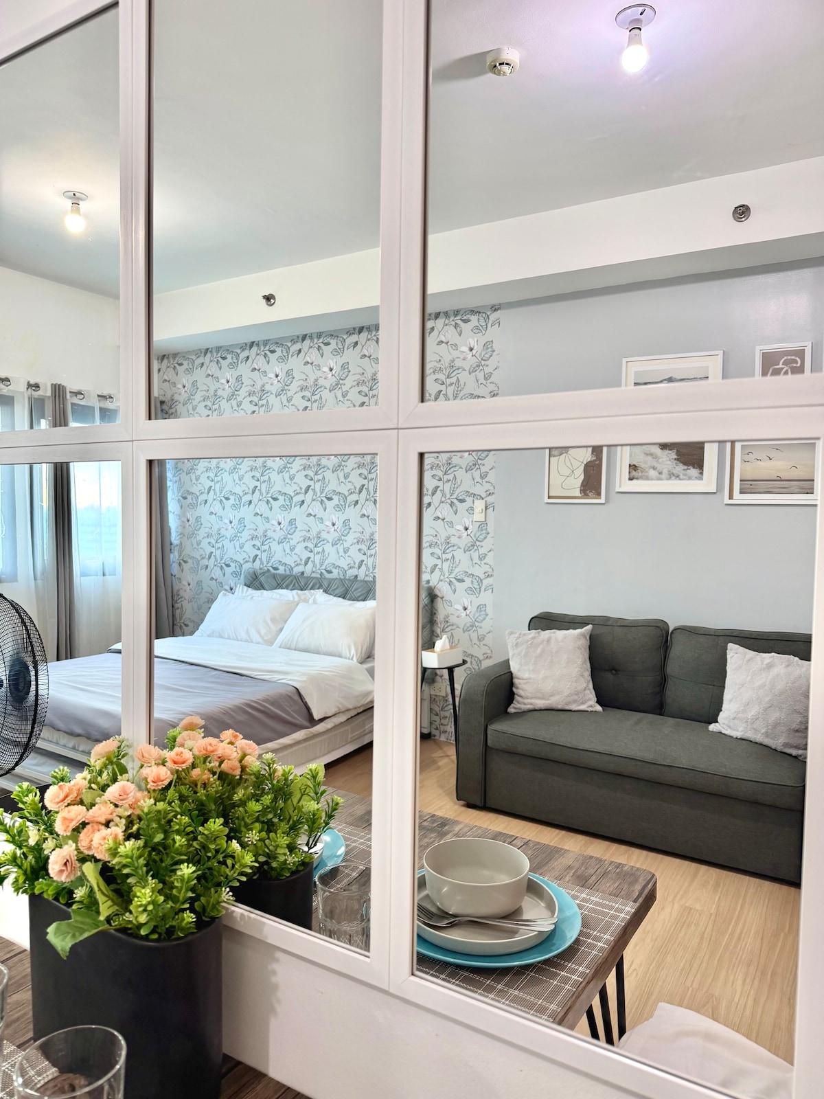 Relax with the whole family at this peaceful place to stay Bedroom Double size bed with Foam Mattress 4 large pillows 1 comforter + linen Smart Tv with Netflix Wifi Side table Aircondition Living/Dining Sofa 2-seater Dining table and chair Refrigerator Microwave oven Induction cooker Rice cooker Kettle Pot Mugs / plates / spoon&fork Trash Can 2-Mirror Bathroom Bidet Mirror Sink Water heater Shower telephone Trash Can One-time set up and freebie 2bottled water 1tissue roll SELF CHECK-IN