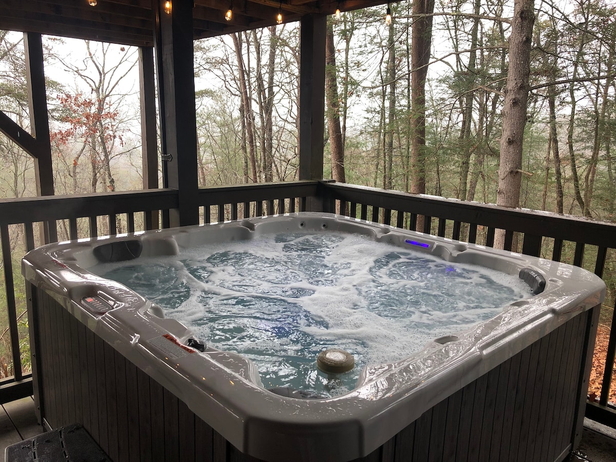 A quick drive from the city and you've arrived at this peaceful escape. Yet when the mood strikes for great restaurants, trendy bars/breweries, or unique small-town shopping, you're only minutes away from downtown Blue Ridge. In this completely updated cabin you'll experience total privacy in the indoor hot tub, gorgeous screened in porch with swing bed and tv, huge walk-in shower, serene firepit, new grill & firepit table. And if you must work before slipping out for a hike, we have fast wifi!