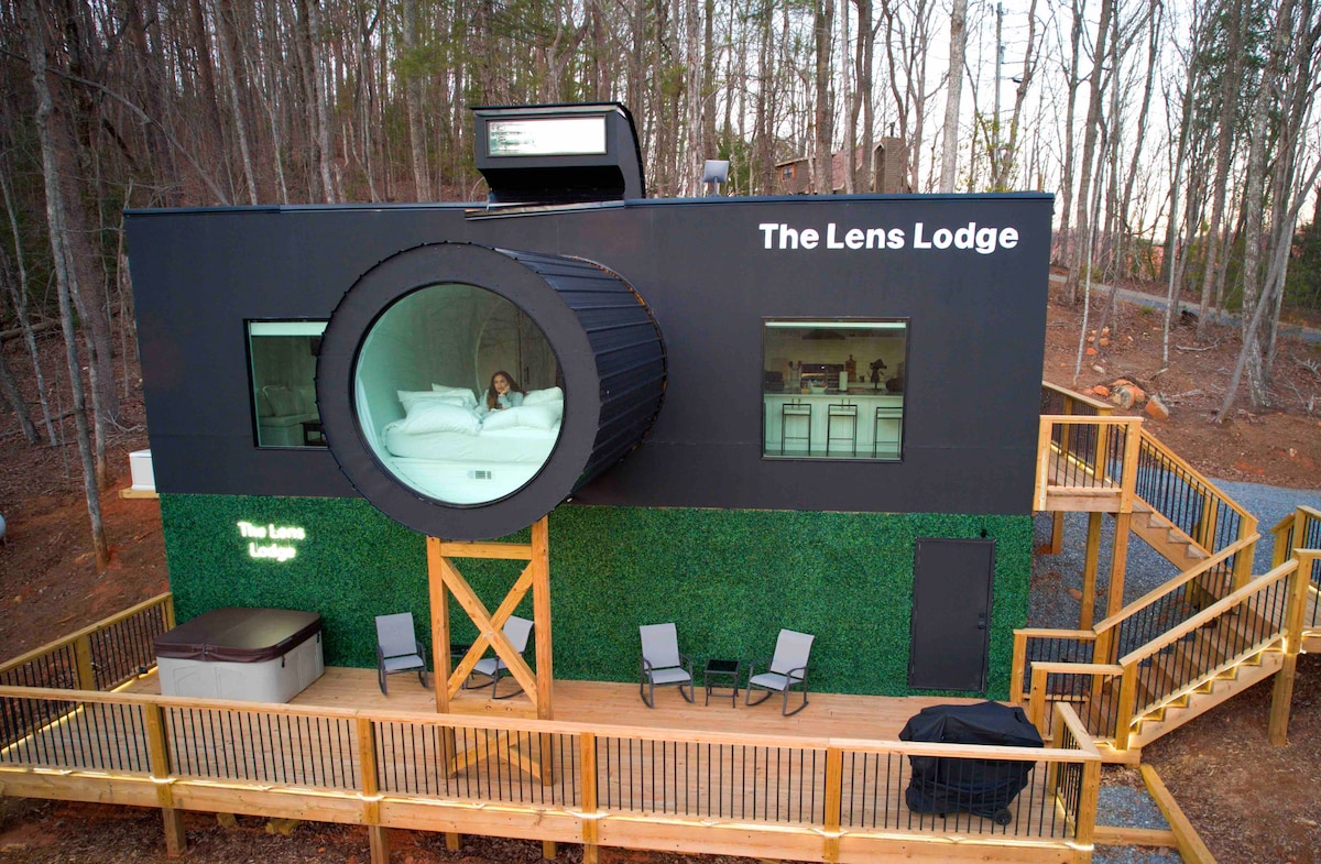 Ever dreamed of sleeping in the lens of a camera on the top of a mountain with breathtaking views? Yeah, us too! In this OMG! Fund-winning stay you will sleep in the lens roughly 15 feet above the ground with a full circular window allowing you to see the beautiful mountainscape from bed. Secluded between two of North Ga's most popular mountain towns, this modern camera themed house is the perfect balance of fun and luxury, from polaroids to document your stay to a luxury rainfall shower.