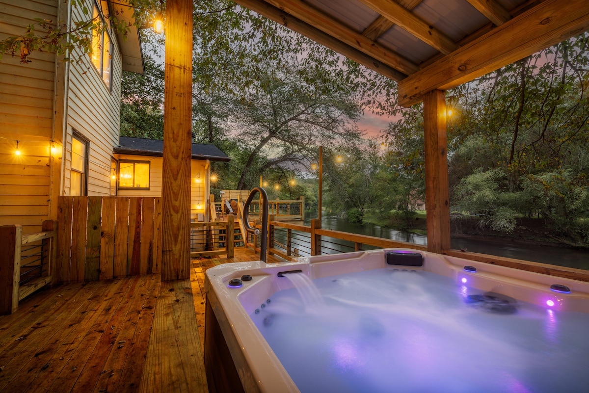 Escape to the serene charm of Lantern Landing, a brand-new cabin perched above Lake Blue Ridge. This 3-bedroom retreat blends luxury and comfort with en-suite bathrooms, sweeping lake views from a private deck, and inviting common areas. Unwind by the outdoor fire pit, soak in the hot tub, or explore the lake with complimentary kayaks. The patio features a large flat-screen TV and a game table with ping-pong and air hockey. Lantern Landing offers an unforgettable getaway for family and friends.