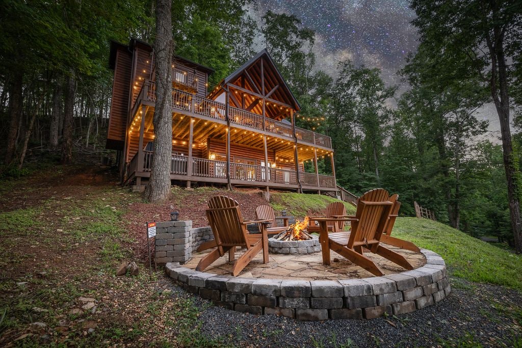 Your Blue Ridge Mountain View Escape awaits! Enjoy breathtaking, layered 50-mile mountain views from this immaculate log cabin. Designed for relaxation and romance, with multiple outdoor decks, private hot tub, cozy indoor and outdoor fireplaces, fire pit, and pool table. Perfect for special occasions or couples featuring two King suites separated for privacy. Updated and stocked with essentials, it blends rustic charm with modern comfort; located exactly between Blue Ridge and Ellijay.