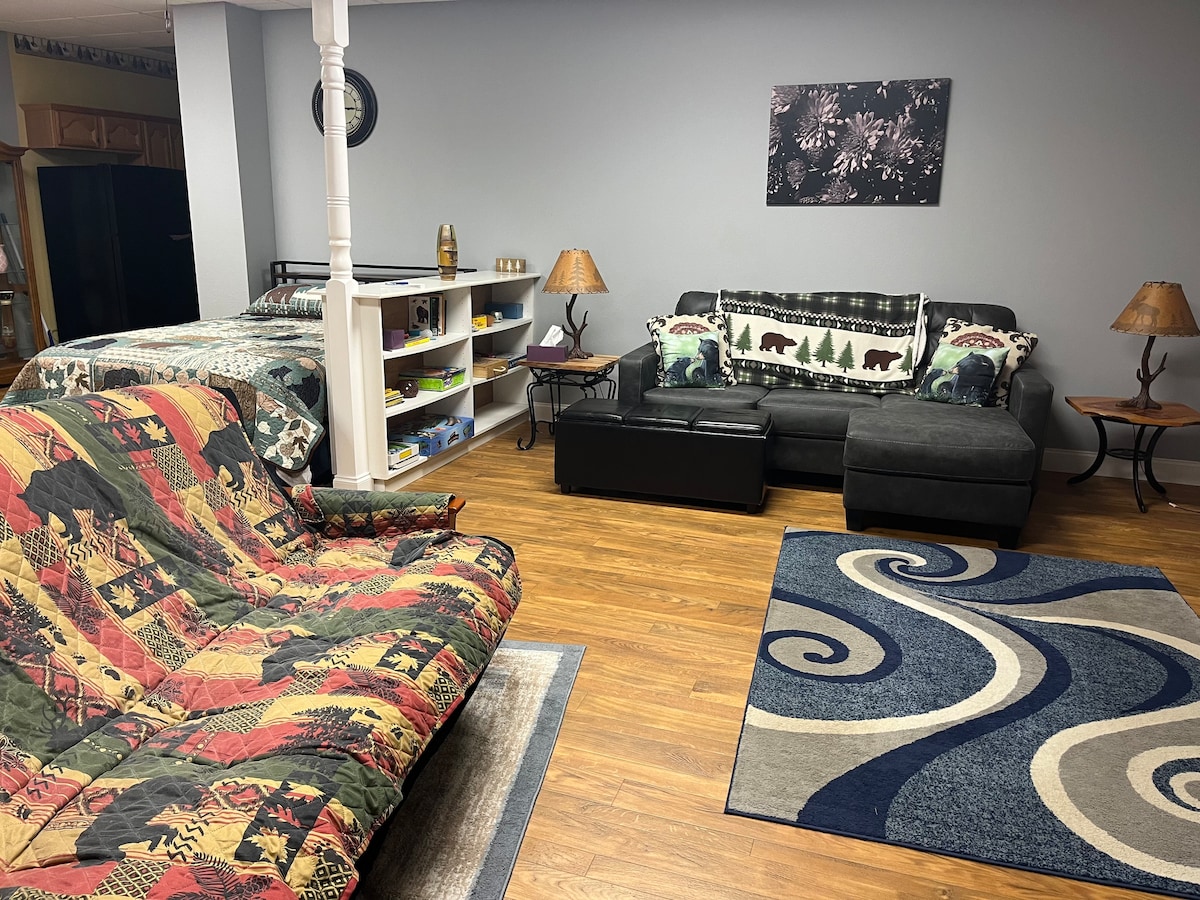 780 Sq feet - Basement Apt (We live upstairs)., Pet-friendly (dogs only, must be fully housebroken) If bringing a dog it must be on a leash when outside. Private entrance. No Shared living space. 10 Miles South/east of Blairsville, 5 miles south of BrasstownBald, 6 miles from Vogel State Park, 18 Miles to city of Helen Ga. 15 miles to Lake Nottely, Mountain views, rivers for tubing & fishing, Any number of waterfalls in the area. “UCSTR License # 004922”.