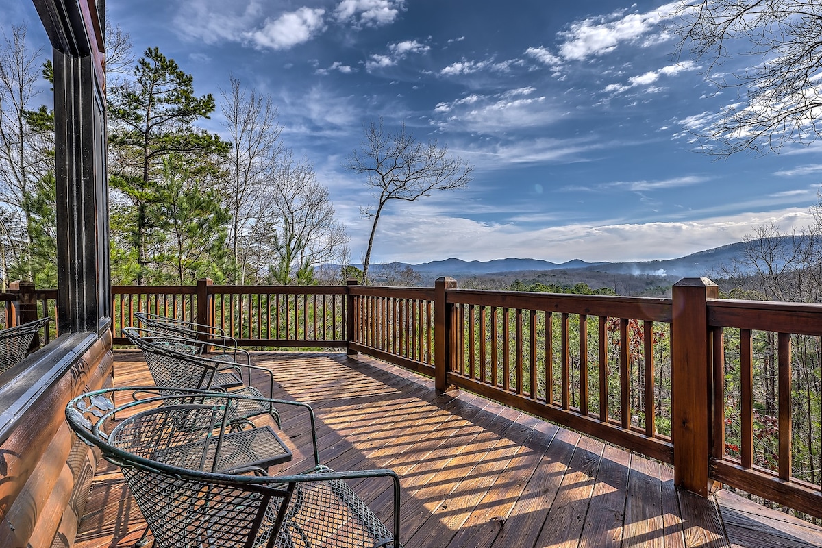 Your Blue Ridge Mountain View Escape awaits! Enjoy breathtaking, layered 50-mile mountain views from this immaculate log cabin. Designed for relaxation and romance, with multiple outdoor decks, private hot tub, cozy indoor and outdoor fireplaces, fire pit, and pool table. Perfect for special occasions or couples featuring two King suites separated for privacy. Updated and stocked with essentials, it blends rustic charm with modern comfort; located exactly between Blue Ridge and Ellijay.