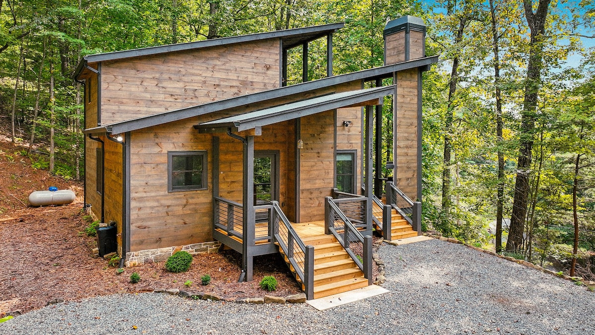 A quick drive from the city and you've arrived at this peaceful escape. Yet when the mood strikes for great restaurants, trendy bars/breweries, or unique small-town shopping, you're only minutes away from downtown Blue Ridge. In this completely updated cabin you'll experience total privacy in the indoor hot tub, gorgeous screened in porch with swing bed and tv, huge walk-in shower, serene firepit, new grill & firepit table. And if you must work before slipping out for a hike, we have fast wifi!