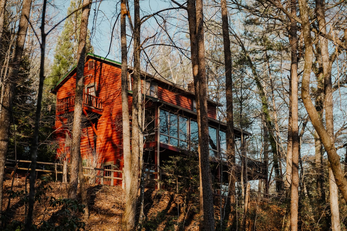"This is one of the only places I've found that I can truly relax and recharge from the stresses of life.” - Brandon Nestled atop Allen Lake and situated in Cherry Log (population 120!) between the charming towns of Blue Ridge and Ellijay in the North Georgia mountains, it’s almost impossible not to relax into the tranquil atmosphere of our Lakeside ‘Treehouse’. "…it’s a bit of luxury tucked away deep in the woods on a quiet lake, and just down the road from a beautiful waterfall." – Rebecca
