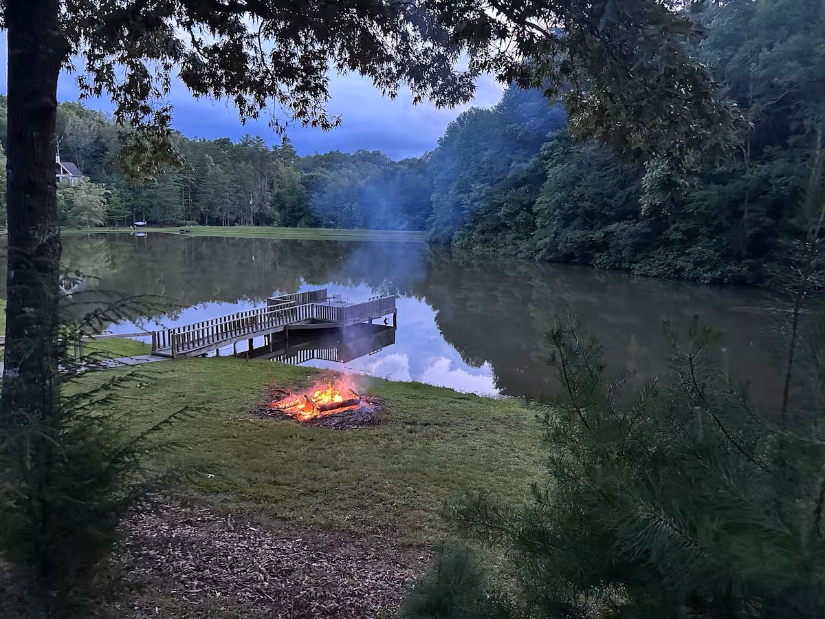 💰No nickel & diming — AirBnb & cleaning fees in nightly rate! 🏡 4-Bedroom Waterfront Log Cabin on Blue Ridge Lake 🏞️ Large Screened-In Porch: Cozy Gas fireplace, lots of seating, porch swing, dining area for 10 🔥 Cozy Firepit and Hot Tub 👩🏼‍🍳 Big Green Egg & Blackstone Grills 🏓 Fun for All Ages: ping pong, Xbox, board games+ 🚣🏻 Private dock w/ trampoline, diving board, kayaks, paddleboard,& more 😴 Plush Bedding & Luxurious Linens 🛜 Reliable High-Speed Internet 🐶 Pet-Friendly!