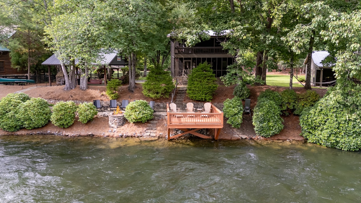 💰No nickel & diming — AirBnb & cleaning fees in nightly rate! 🏡 Exquisitely designed 4-Bedroom Waterfront Log Cabin on Blue Ridge Lake 🚣🏻 Private dock w/ trampoline, diving board, kayaks, paddleboard,& more 🏞️ Screened-In Porch: Gas fireplace, porch swing, dining area for 10 🏓 Fun for All Ages: Hot tub, ping pong, Xbox, board games+ 🔥 Cozy Firepit 👩🏼🍳 Fully Stocked Kitchen, Big Green Egg & Blackstone 😴 Plush Bedding & Luxurious Linens 🛜 Reliable High-Speed Internet 🐶 Pet-Friendly!