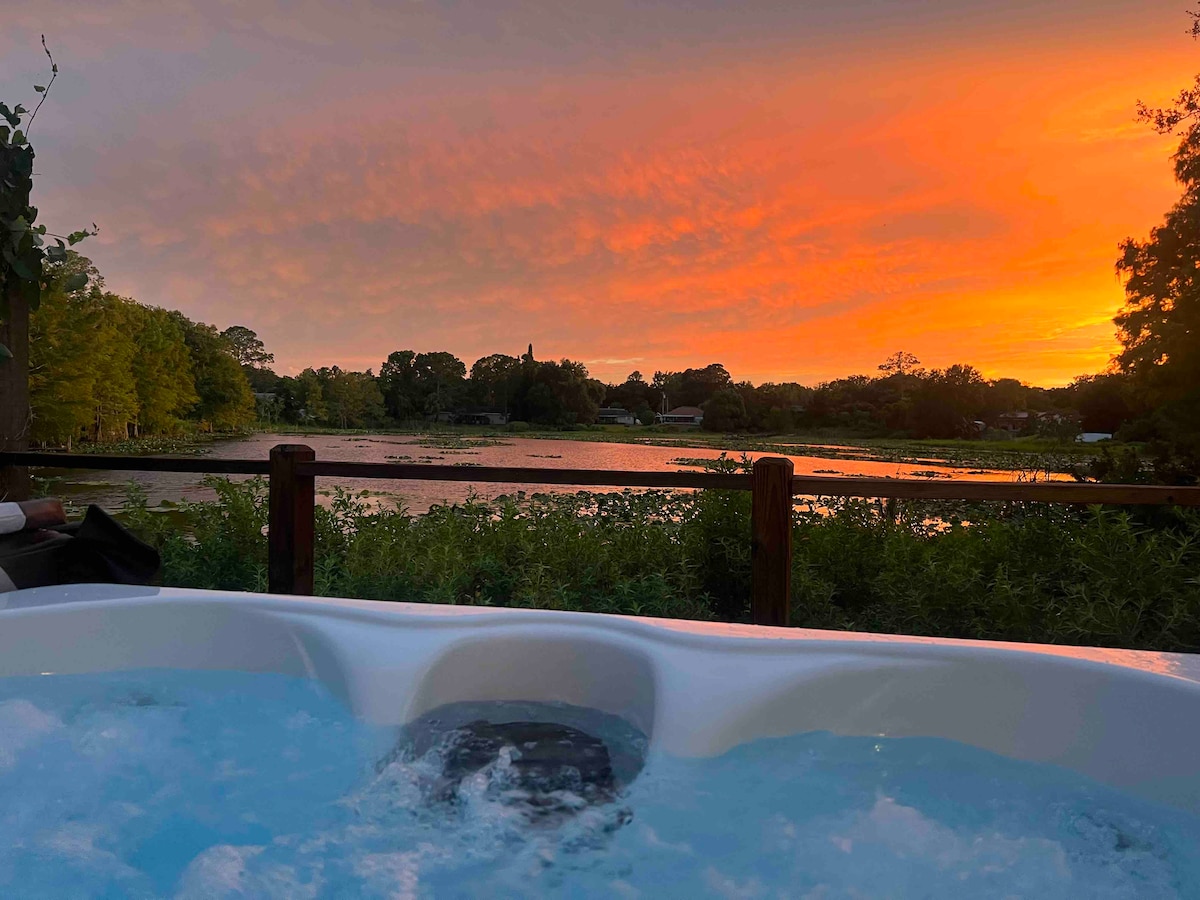 The Zen Lake Front Cutie is teaming with wildlife! Enjoy exquisite sunsets while lounging on the wrap around deck or relaxing in the therapeutic hot tub. A star gazer's delight, a bird watcher's paradise. Zen & eclectic: original art, exotic décor, Zen lighting, & Indonesian wood. Just a hop from I4, 30 mins from New Smyrna beach, 40 mins from Orlando, 50 from MCO airport/Disney/Sea World. 5-10 mins from the natural Blue Springs, Green Springs, Gemini Springs & the iconic St. John's River.