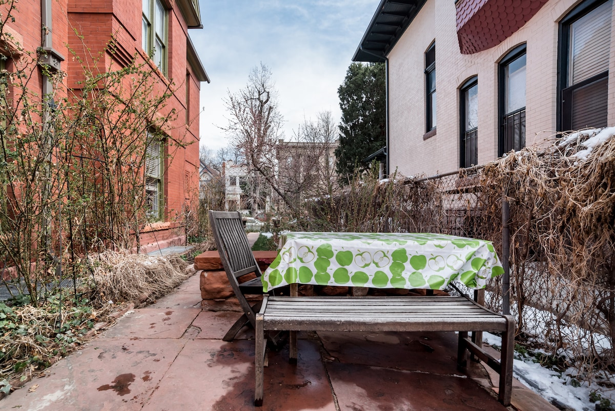 Soak up the vintage charm of this basement hideaway built by a silver baron in 1891, featuring original red brick walls and oriental rugs. Old England meets the Wild West, while mementos from international travels add even more character. We will keep you safe during your visit. We have a dedicated professional cleaner for the apartment, who cleans and disinfects between guests based on CDC guidelines. There are sanitizers and cleaning supplies for your use in the apartment, and you need never meet us. The apartment is part of the original basement from 1891, so it has exposed granite exterior walls and interior brick walls. The apartment includes a newly renovated kitchen and bathroom, new heating, tile floors, oriental carpets, and a new (firm) bed. Air conditioning was installed in July 2019 to keep you cool. The apartment is decorated with Colorado antiques, with the exception of the new bed and new sofa bed. Much like when the house was originally decorated by the Irish-born gentleman who struck silver, it is old-England-meets-the-Wild-West, with mementos from international travels. The bedside lamp is made out of the bottle of champagne drunk the night in 1978 uncle B. first met the beautiful and mysterious K. in St Moritz, the drawing from old Cairo was bought back in 1921, and we often wonder who the Turkish officer was whose 1890s portrait was found in great-uncle's estate. The apartment has English linen curtains, and some of life's smaller necessities, such as Frette linens, down comforters, hard and soft pillows, marble in the bathroom and crystal wine glasses. In season, it will have fresh flowers from the garden. It features a fully equipped kitchen with Brita filtered water. Also included are everything we hope you will need: hair dryer alarm clock iron ironing board toaster electric kettle microwave gas stove refrigerator with freezer basic toiletries For your safety and privacy, the apartment includes an egress window and safety exit, safety card, two fire extinguishers, fire alarm system, carbon monoxide sensor, first aid kit, non-slip bath mat, window blinds, bed and bathroom door locks, and a Remote Lock electronic deadbolt, with a dedicated code for each guest. Outside the guest entrance is a small common picnic area with table seating, and a propane fire column. Use the On-site coin operated guest laundromat (down the stairs from the Common Southside Entrance). We most often parallel park in front on the street, and if you have a car, you can do likewise. It's usually easy parking on our block. However, as an alternative to street parking, when available, you can rent from us a $10/day designated parking space in back (2 spots offered for 3 apartments). Let us know your vehicle plate, model & make at check-in, so you don't get towed. Access is automated online--you'll receive keypad codes upon booking (for Common Southside Entrance & also for your Apartment door). The codes for your apartment door are auto-generated, and issued directly to you. Once you get settled in, check out our welcome package. We live onsite, and you can phone us anytime during your stay, so don't hesitate to phone us to say hello, request a tour, or for questions. When in season, ask to visit our bees or discuss the roses or other garden plants, or we can chat about our favorite spots in the neighborhood. The property is located very close to the longest and once considered the most wicked main street in America, Colfax Avenue. Visit Cheeseman Park for a walk, connect with plants at Denver Botanic Gardens, and jog to the pool at Congress Park. Many guests walk everywhere from here. If you're visiting Denver from out of town, consider going sans auto. You can walk a block, hop on the bus. This property has a rocking bike score (97). Check out a bike at Denver B Cycle Station Rental located just on the other side of our street. For a small town version of a NYC Central Park leisurely or work out bike ride, you may find that a ride in City Park isn't a bad substitute. A quick $10 Uber ride can get you to Union Station trains, LoDo's nightlife, the Convention Center, any ball game, or a show at the Center for Performing Arts. We have children, so please no drugs, and no smoking or vaping of any kind anywhere on the property. We have pets, but they reside with us, and do not have access to the apartments. Due to the turnover rates for the apartments, and the burden it would cause to prepare each apartment for the next guest, we can't allow pets. If you miss your cat or dog, you can ask to pet ours! Our listings are stand-alone private apartments designed to be full rentals for urban professionals. The apartments are affixed to our historic home, which has its own page in "The Wyman Historic District" of the Historic Denver Guide Series. The garden is private, but you'll walk through it to reach the Common Southside Entrance. When in season, it's buzzing and chirping. This apartment is very private and relatively quiet for the city. You may hear sirens, sometimes, since it's located near Colfax. Sometimes when upstairs Airbnb renters walk, depending on the renters, you may hear steps.