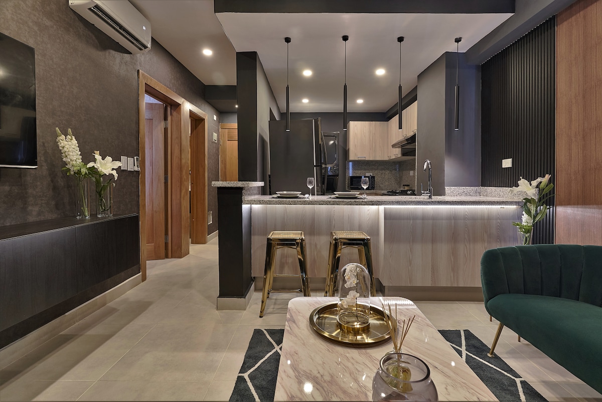 Nuevo apartamento ubicado en el 5to Piso con vista al centro de la ciudad de Santo Domingo. Cuenta con amplia habitación equipada con todas las comodidades para el descanso de nuestros huéspedes; cama King, TV Smart, Aire Acondicionado, Amplio closet, caja de seguridad, entre otros. El apartamento cuenta con internet de alta velocidad, aire acondicionado central, espacios de trabajo, balcón, cocina equipada y cómoda sala de estar.